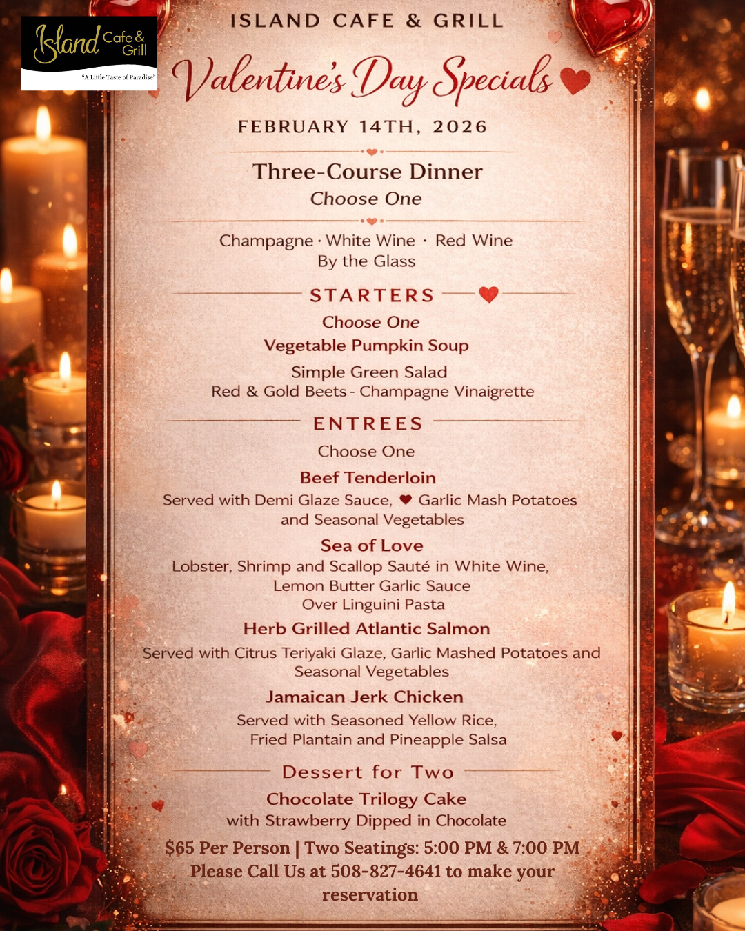 Spend the night with your special someone with dinner at Island Cafe and Grill this Valentine's. Call 1 (508) 827-4641 to make your reservation today.